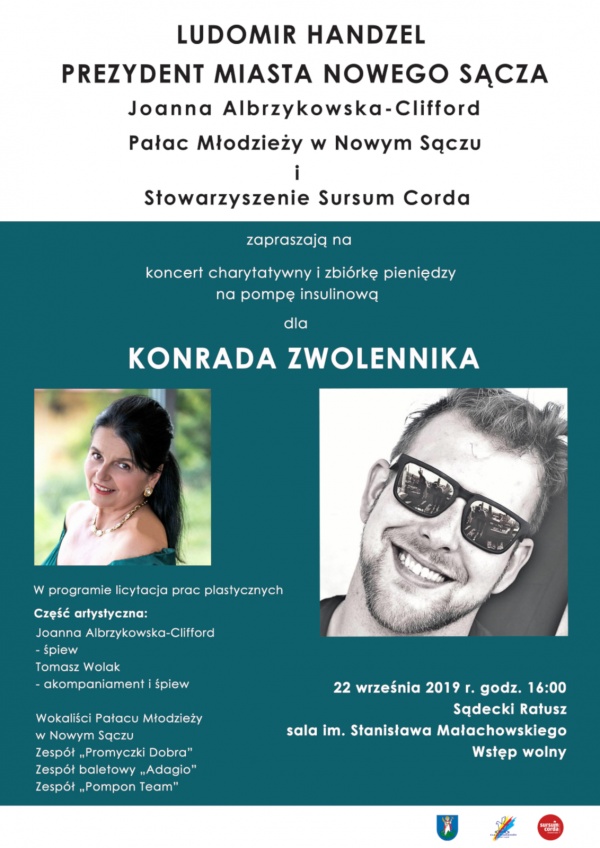 W niedzielę 22 września o godz. 16:00 w sali im. Stanisława Małachowskiego sądeckiego ratusza odbędzie się koncert charytatywny połączony ze zbiórką pieniędzy na zakup pompy insulinowej dla Konrada Zwolennika. Inicjatorem wydarzenia jest znana sopranistka Joanna Albrzykowska-Clifford, która w tym dniu zaśpiewa również dla sądeckiej publiczności. Patronat nad koncertem objął Prezydent Nowego Sącza Ludomir Handzel. Wstęp Wolny.
