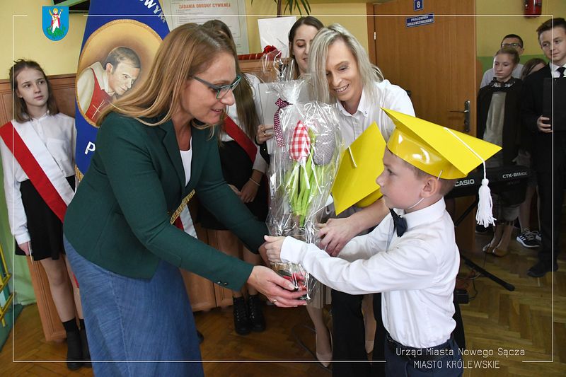 Pasowania za pomocą słusznych rozmiarów ołówka dokonała wiceprezydent Nowego Sącza, a dyrektor Wydziału Edukacji i Wychowania Małgorzata Belska rozdała dzieciom podarunki – książeczki i słodkości, które pomogły osłodzić stres tego dnia.