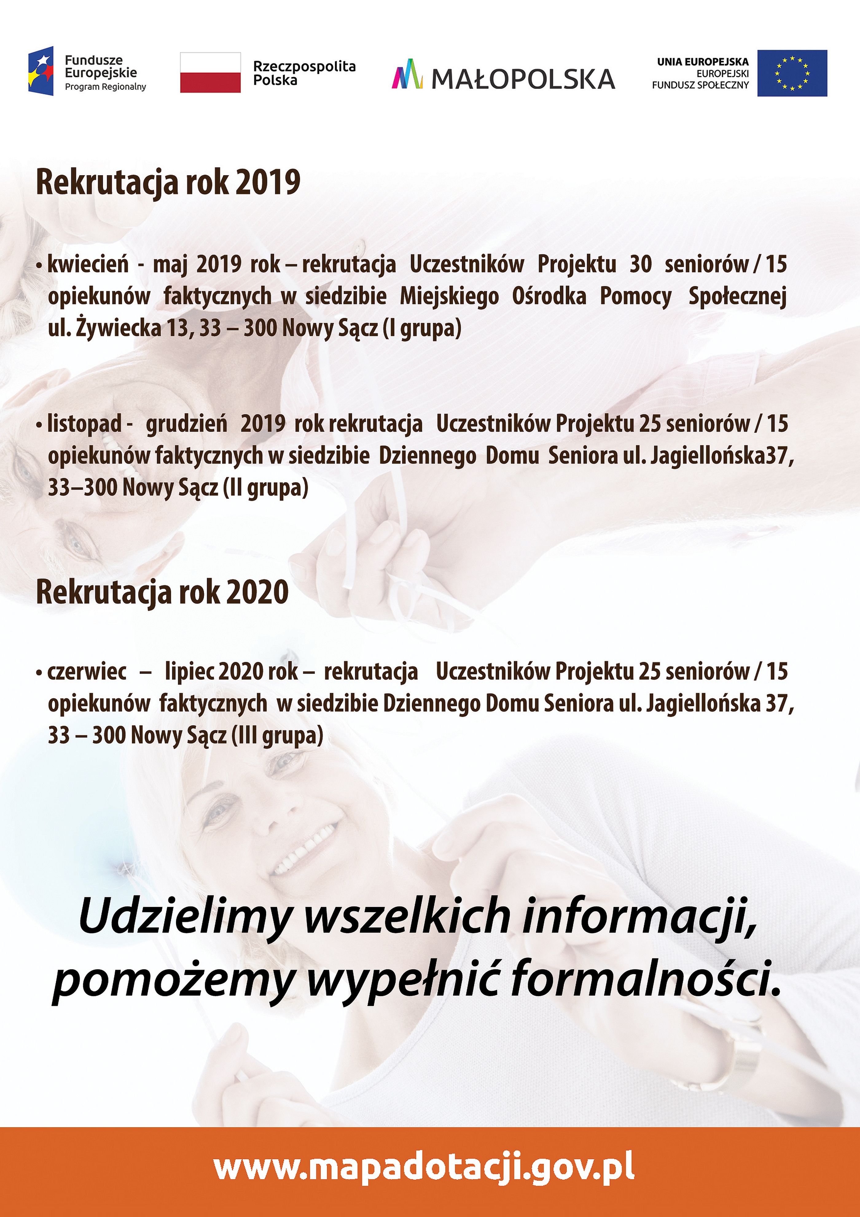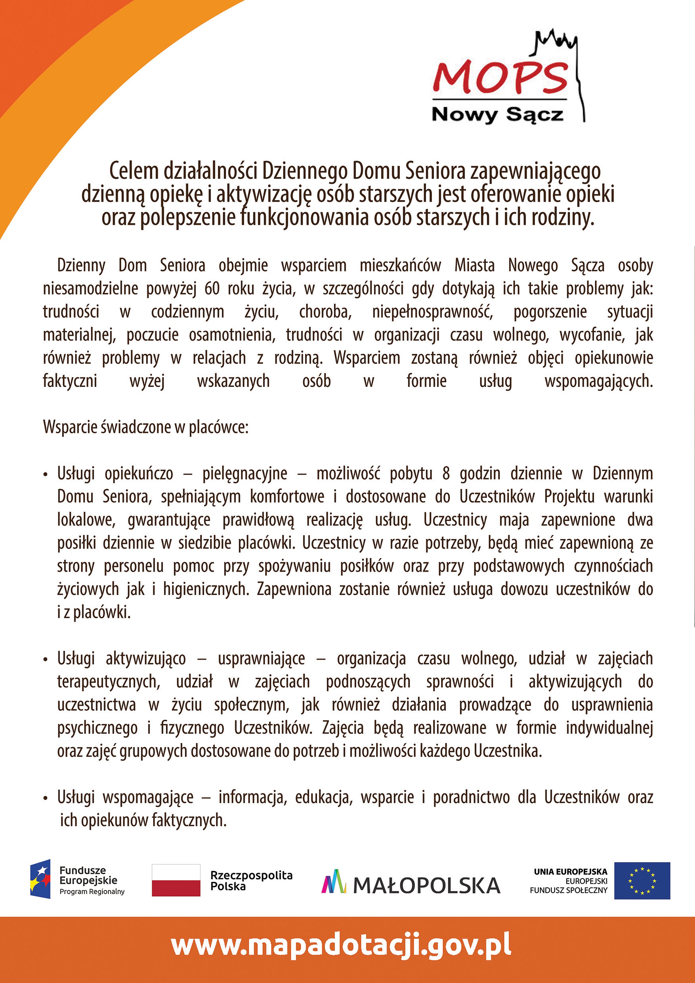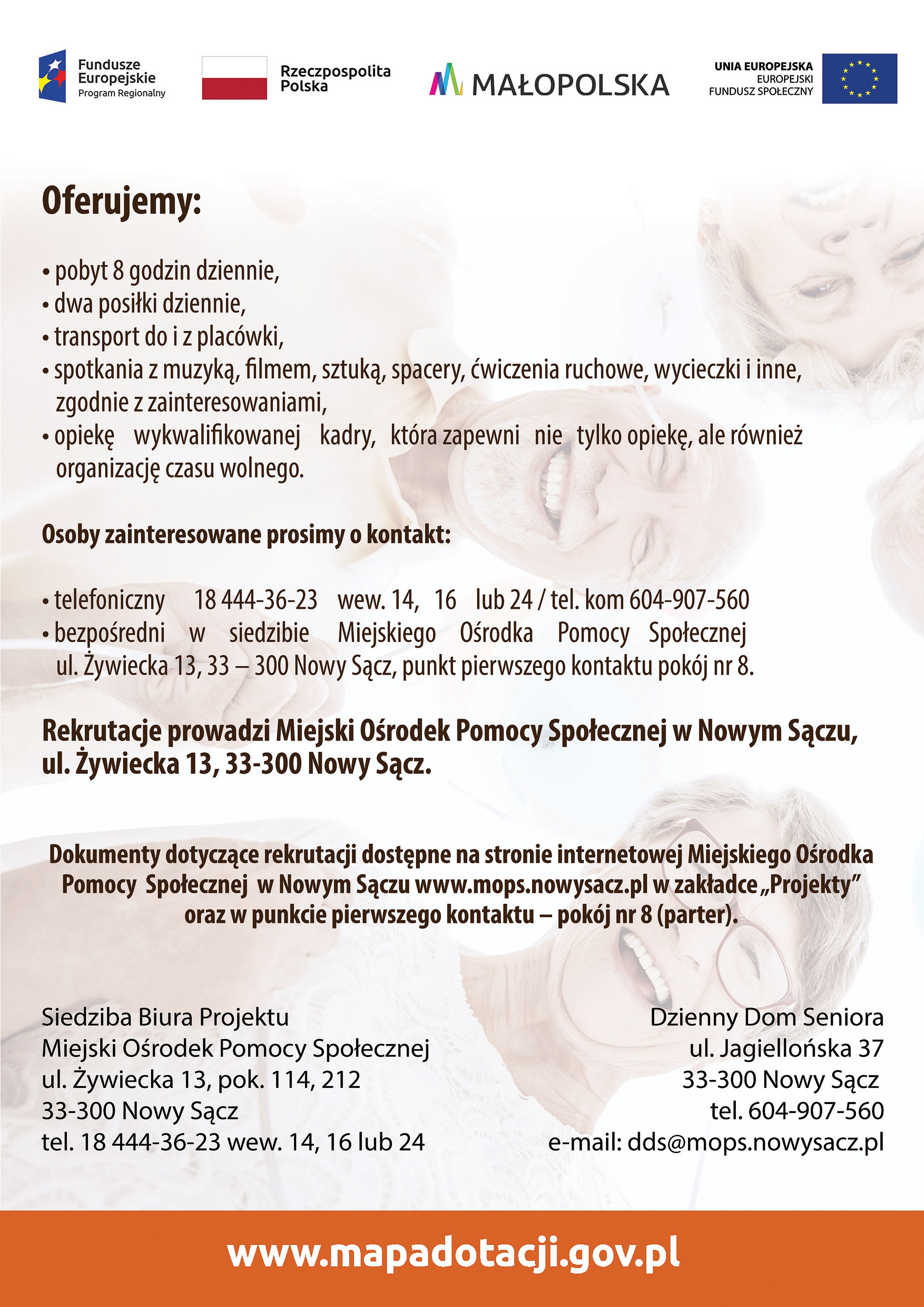lub bezpośredni w siedzibie Dziennego Domu Seniora ul. Jagiellońska 37 oraz Miejskiego Ośrodka Pomocy Społecznej ul. Żywiecka 13, 33-300 Nowy Sącz, Punkt Pierwszego Kontaktu, pokój nr 8 na parterze.