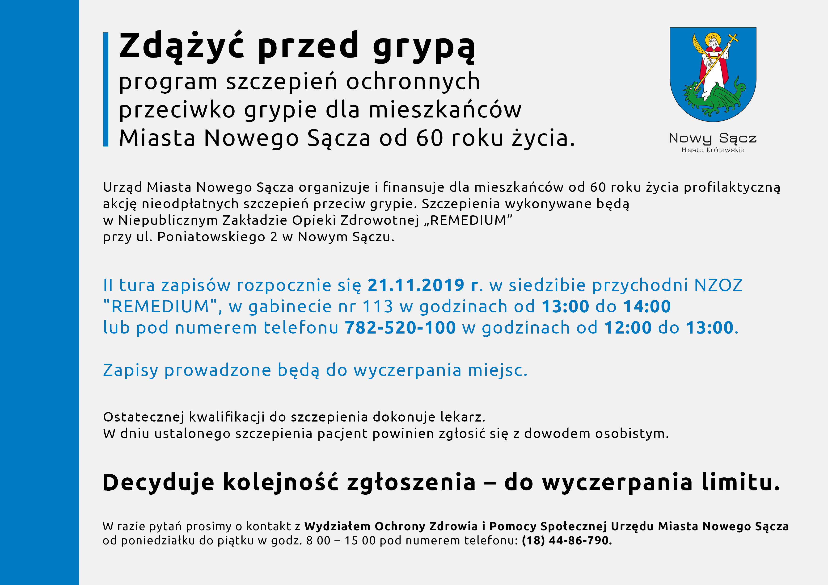 W razie pytań prosimy o kontakt z Wydziałem Ochrony Zdrowia i Pomocy Społecznej Urzędu Miasta Nowego Sącza, od poniedziałku do piątku w godz. 8:00 – 15:00 pod numerem telefonu: 18 44 86 790. Informacje na temat II tury zapisów na szczepienia zostaną podane do 18 listopada 2019 r.