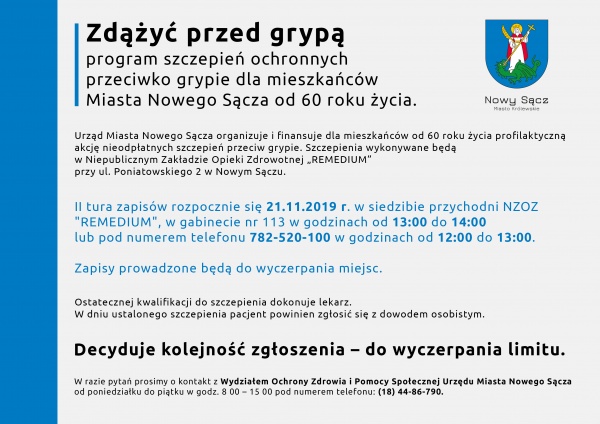 Urząd Miasta Nowego Sącza organizuje i finansuje profilaktyczną akcję nieodpłatnych szczepień przeciwko grypie pod nazwą: "Zdążyć przed grypą" dla mieszkańców od 60. roku życia. Szczepienia wykonywane będą w Niepublicznym Zakładzie Opieki Zdrowotnej „REMEDIUM” przy ul. Poniatowskiego 2 w Nowym Sączu.