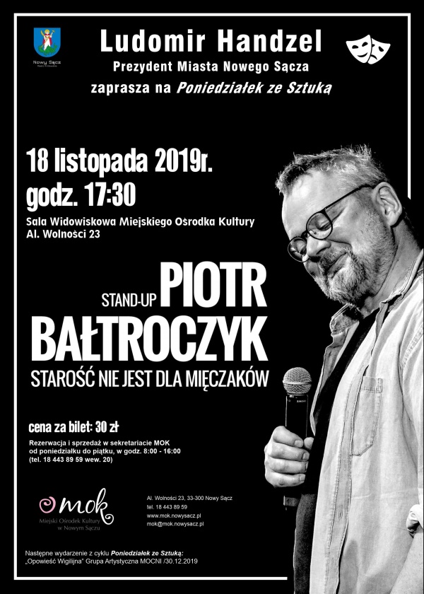 Starość nie jest dla mięczaków: tak twierdzi Piotr Bałtroczyk, satyryk, konferansjer, jedna z najbardziej rozpoznawalnych postaci polskiej sceny kabaretowej. Skąd tytułowe przekonanie? Artysta wyjaśni to ze sceny Miejskiego Ośrodka Kultury 18 listopada br. Na kolejny Poniedziałek ze Sztuką zaprasza prezydent Nowego Sącza Ludomir Handzel.