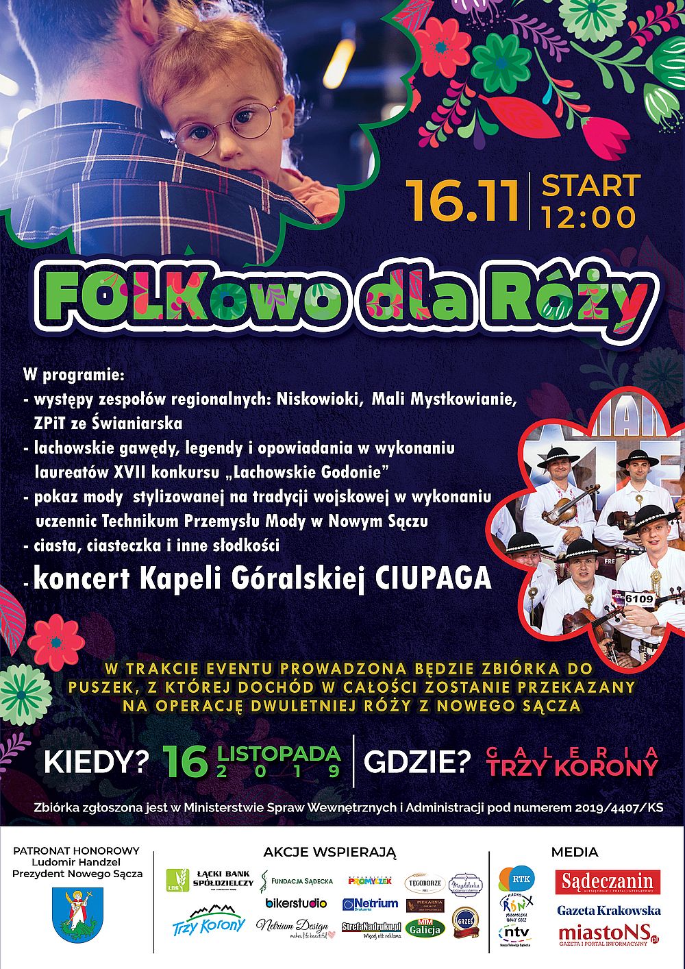 "FOLKowo dla Róży" to cykl koncertów, które rozpoczną się w sobotnie południe od występów zespołów: Niskowioki, Mali Mystkowianie i Zespołu Pieśni i Tańca ze Świniarska. Laureaci konkursu "Lachowskie Godonie" zaproszą widzów na regionalne gawędy, legendy i opowiadania. Uczennice Technikum Przemysłu Mody z Nowego Sącza zaprezentują pokaz mody stylizowanej na tradycję wojskową. Imprezę zakończy koncert góralskiej kapeli "Ciupaga."